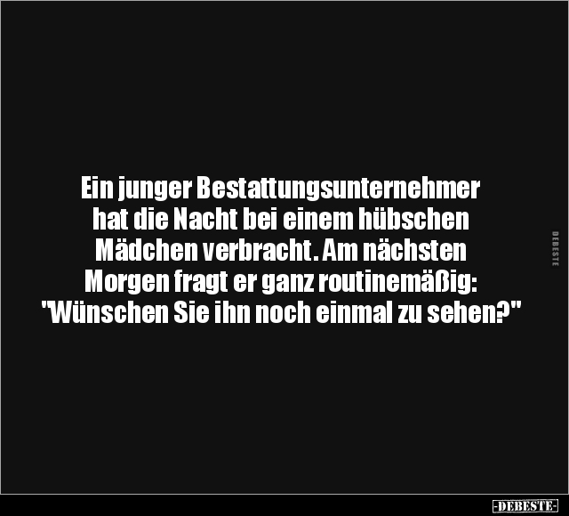 Ein junger Bestattungsunternehmer hat die Nacht bei einem hübschen Mädchen verbracht. Am nächsten Morgen fragt er ganz routinemäßig: "Wünschen Sie ihn noch einmal zu sehen?"