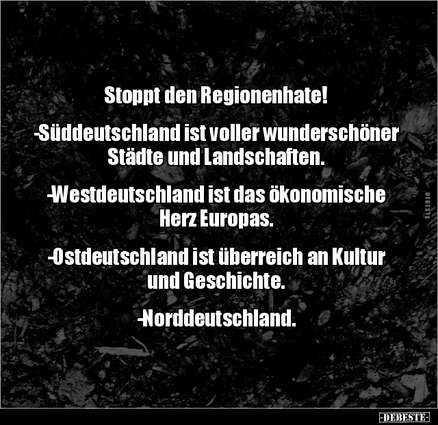 Stoppt den Regionenhate! -Süddeutschland ist voller wunderschöner Städte und Landschaften. -Westdeutschland ist das ökonomische Herz Europas. -Ostdeutschland ist überreich an Kultur und Geschichte. -Norddeutschland.