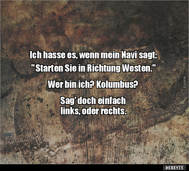 Ich hasse es, wenn mein Navi sagt: " Starten Sie in Richtung Westen." Wer bin ich? Kolumbus? Sag’ doch einfach links, oder rechts.