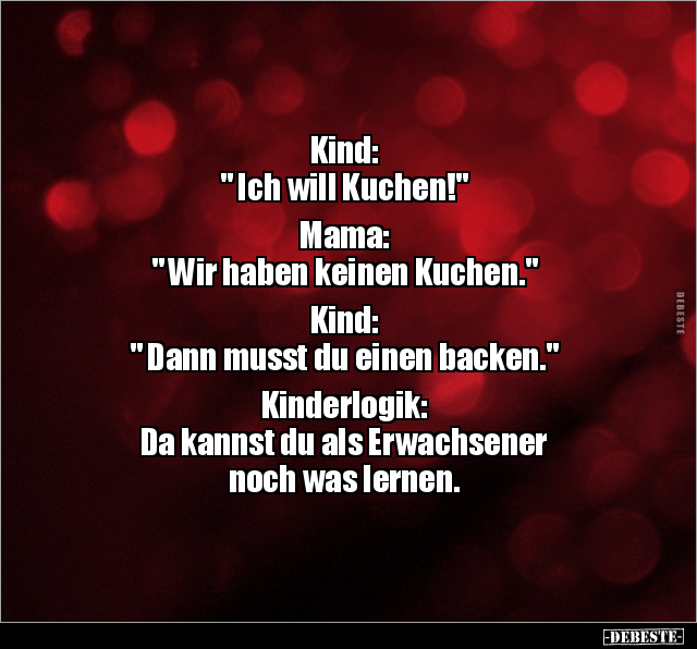 Kind: " Ich will Kuchen!" Mama: " Wir haben keinen Kuchen." Kind: " Dann musst du einen backen." Kinderlogik: Da kannst du als Erwachsener noch was lernen.