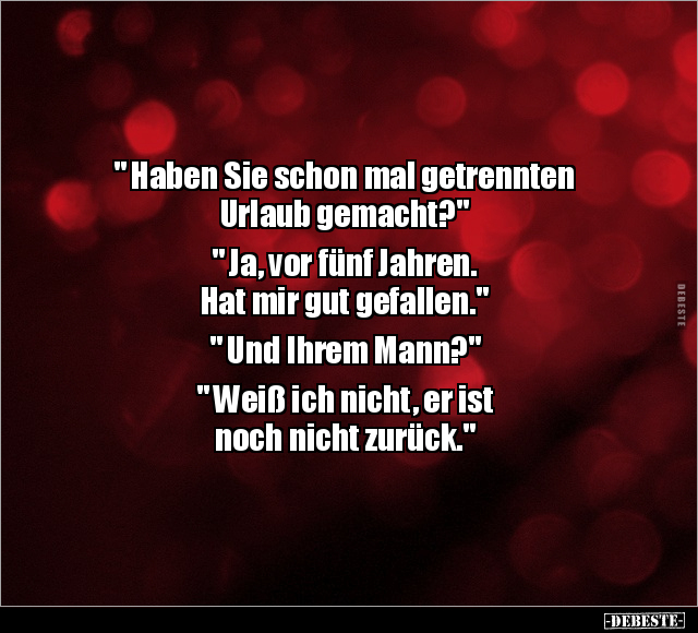 " Haben Sie schon mal getrennten Urlaub gemacht?" " Ja, vor fünf Jahren. Hat mir gut gefallen." " Und Ihrem Mann?" " Weiß ich nicht, er ist noch nicht zurück."