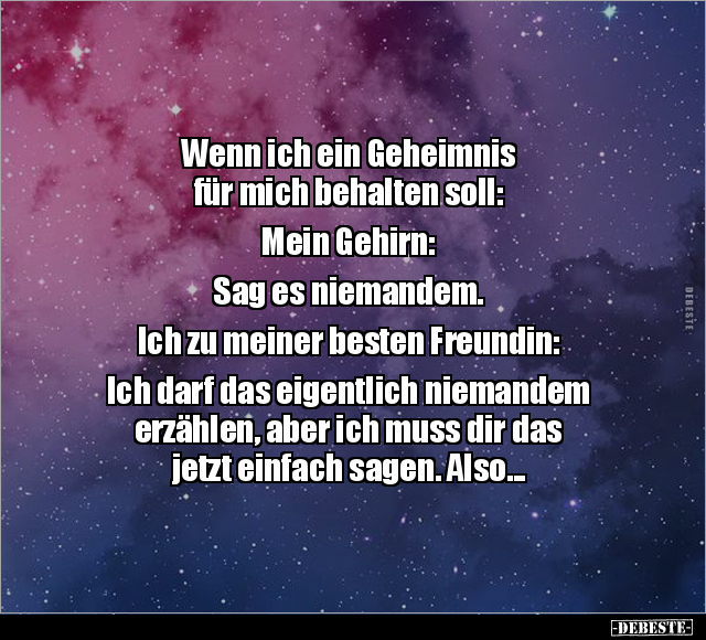 Wenn ich ein Geheimnis für mich behalten soll: Mein Gehirn: Sag es niemandem. Ich zu meiner besten Freundin: Ich darf das eigentlich niemandem erzählen, aber ich muss dir das jetzt einfach sagen. Also...