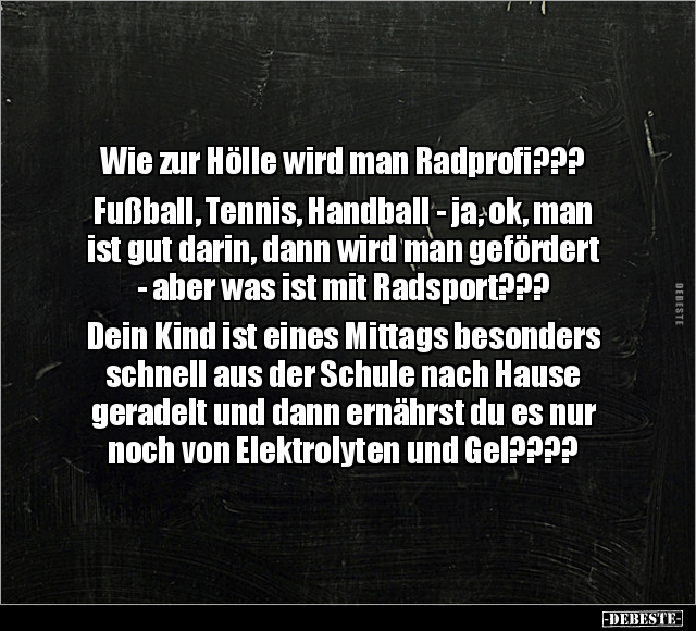 Wie zur Hölle wird man Radprofi??? Fußball, Tennis, Handball - ja, ok, man ist gut darin, dann wird man gefördert - aber was ist mit Radsport??? Dein Kind ist eines Mittags besonders schnell aus der Schule nach Hause geradelt und dann ernährst du es nur noch von Elektrolyten und Gel????