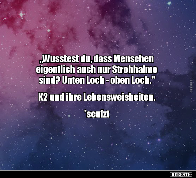 „Wusstest du, dass Menschen eigentlich auch nur Strohhalme sind? Unten Loch - oben Loch." K2 und ihre Lebensweisheiten. *seufzt