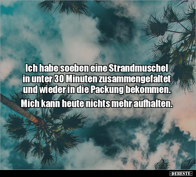 Ich habe soeben eine Strandmuschel in unter 30 Minuten zusammengefaltet und wieder in die Packung bekommen. Mich kann heute nichts mehr aufhalten.