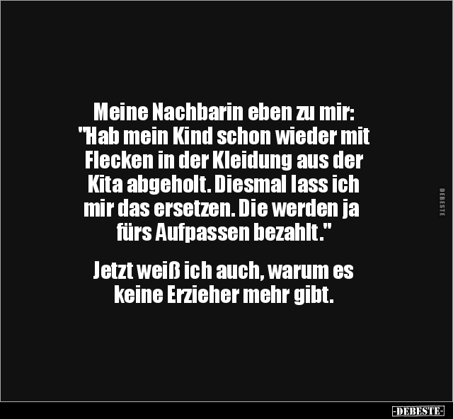 Meine Nachbarin eben zu mir: "Hab mein Kind schon wieder mit Flecken in der Kleidung aus der Kita abgeholt. Diesmal lass ich mir das ersetzen. Die werden ja fürs Aufpassen bezahlt." Jetzt weiß ich auch, warum es keine Erzieher mehr gibt.