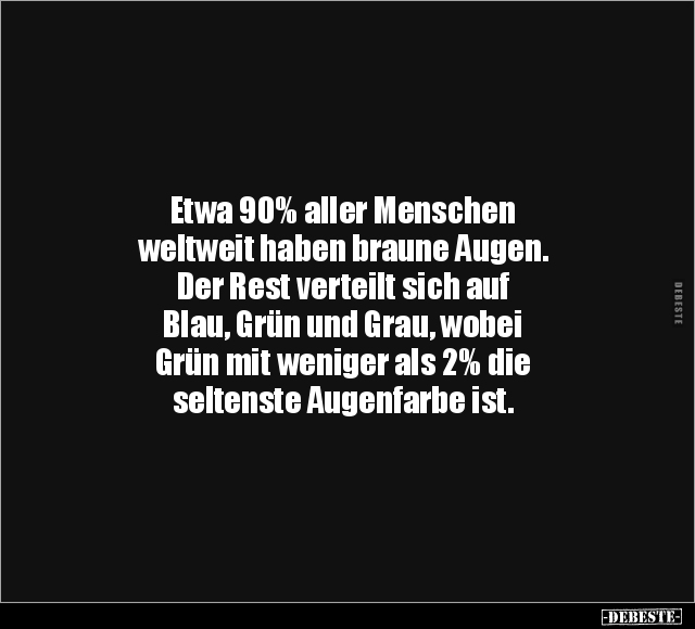 Etwa 90% aller Menschen weltweit haben braune Augen. Der Rest verteilt sich auf Blau, Grün und Grau, wobei Grün mit weniger als 2% die seltenste Augenfarbe ist.