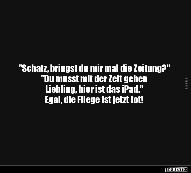 "Schatz, bringst du mir mal die Zeitung?" "Du musst mit der Zeit gehen Liebling, hier ist das iPad." Egal, die Fliege ist jetzt tot!