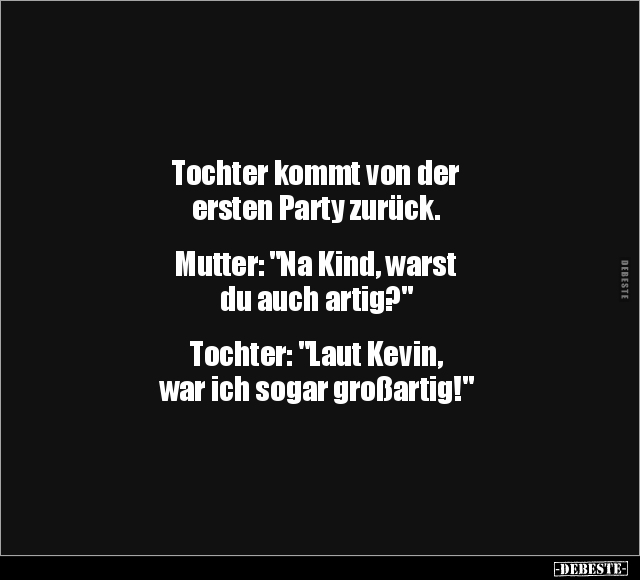 Tochter kommt von der ersten Party zurück. Mutter: "Na Kind, warst du auch artig?" Tochter: "Laut Kevin, war ich sogar großartig!"