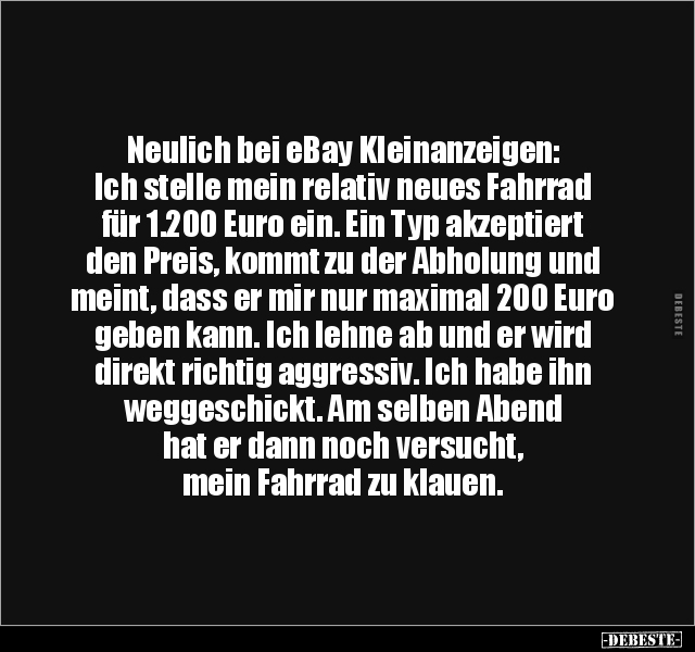 Neulich bei eBay Kleinanzeigen: Ich stelle mein relativ neues Fahrrad für 1.200 Euro ein. Ein Typ akzeptiert den Preis, kommt zu der Abholung und meint, dass er mir nur maximal 200 Euro geben kann. Ich lehne ab und er wird direkt richtig aggressiv. Ich habe ihn weggeschickt. Am selben Abend hat er dann noch versucht, mein Fahrrad zu klauen.