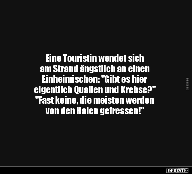 Eine Touristin wendet sich am Strand ängstlich an einen Einheimischen: "Gibt es hier eigentlich Quallen und Krebse?" "Fast keine, die meisten werden von den Haien gefressen!"