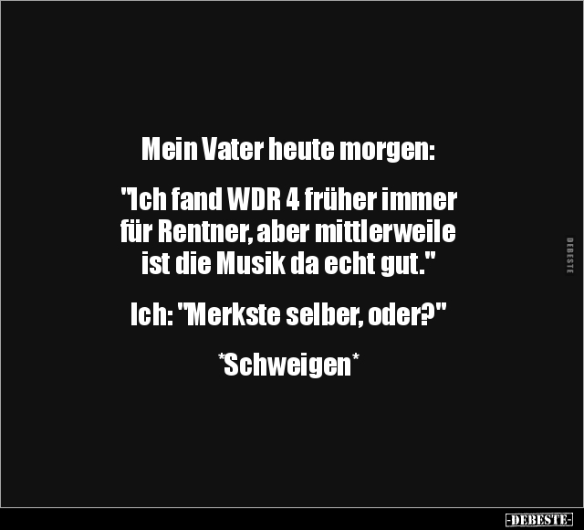 Mein Vater heute morgen: "Ich fand WDR 4 früher immer für Rentner, aber mittlerweile ist die Musik da echt gut." Ich: "Merkste selber, oder?" *Schweigen*