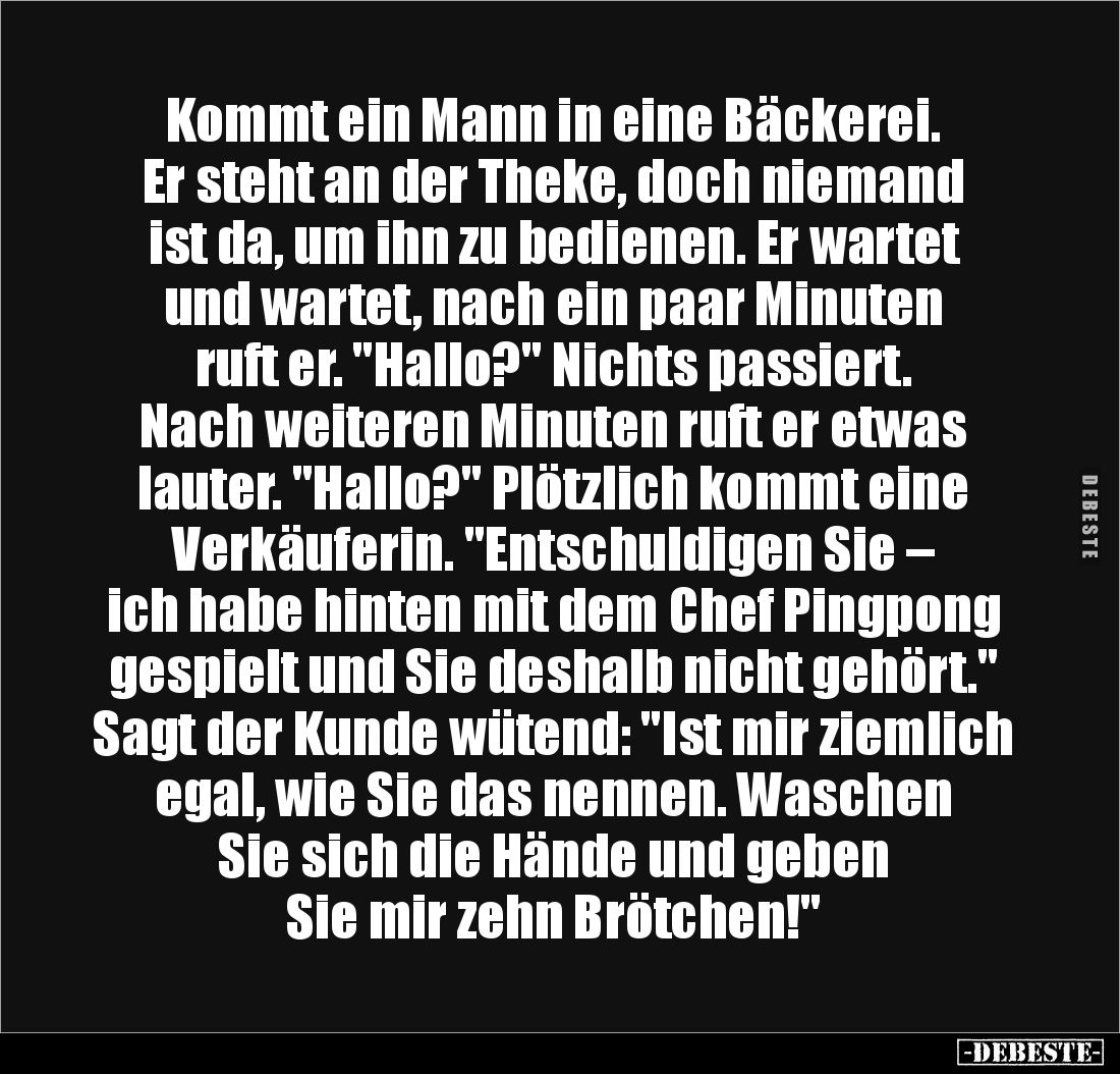 Kommt ein Mann in eine Bäckerei. Er steht an der Theke, doch niemand ist da, um ihn zu bedienen. Er wartet und wartet, nach ein paar Minuten ruft er. "Hallo?" Nichts passiert. Nach weiteren Minuten ruft er etwas lauter. "Hallo?" Plötzlich kommt eine Verkäuferin. "Entschuldigen Sie – ich habe hinten mit dem Chef Pingpong gespielt und Sie deshalb nicht gehört." Sagt der Kunde wütend: "Ist mir ziemlich egal, wie Sie das nennen. Waschen Sie sich die Hände und geben Sie mir zehn Brötchen!"
