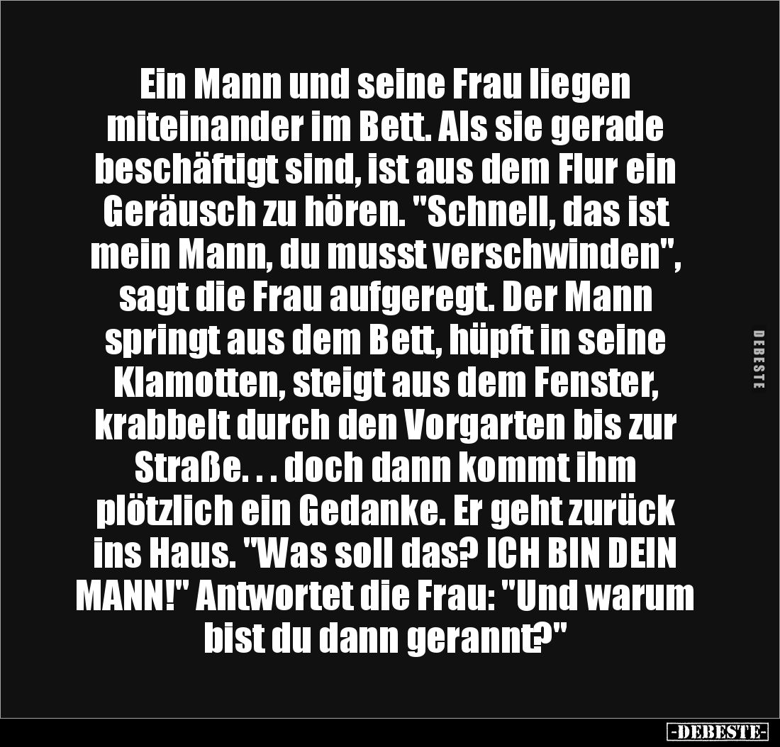 Ein Mann und seine Frau liegen miteinander im Bett. Als sie gerade beschäftigt sind, ist aus dem Flur ein Geräusch zu hören. "Schnell, das ist mein Mann, du musst verschwinden", sagt die Frau aufgeregt. Der Mann springt aus dem Bett, hüpft in seine Klamotten, steigt aus dem Fenster, krabbelt durch den Vorgarten bis zur Straße. . . doch dann kommt ihm plötzlich ein Gedanke. Er geht zurück ins Haus. "Was soll das? ICH BIN DEIN MANN!" Antwortet die Frau: "Und warum bist du dann gerannt?"