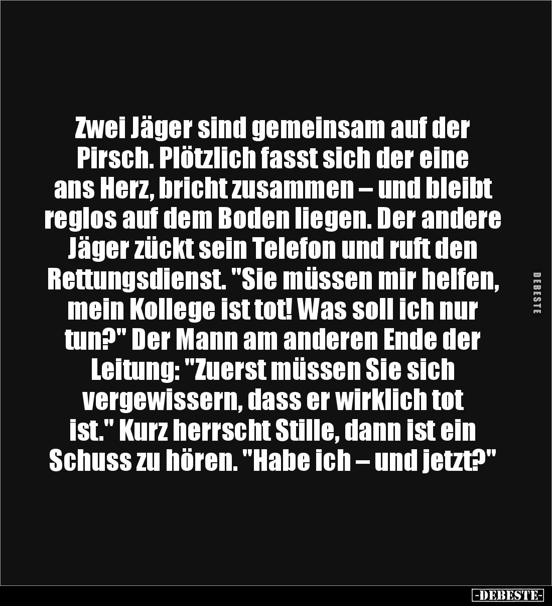 Zwei Jäger sind gemeinsam auf der Pirsch. Plötzlich fasst sich der eine ans Herz, bricht zusammen – und bleibt reglos auf dem Boden liegen. Der andere Jäger zückt sein Telefon und ruft den Rettungsdienst. "Sie müssen mir helfen, mein Kollege ist tot! Was soll ich nur tun?" Der Mann am anderen Ende der Leitung: "Zuerst müssen Sie sich vergewissern, dass er wirklich tot ist." Kurz herrscht Stille, dann ist ein Schuss zu hören. "Habe ich – und jetzt?"