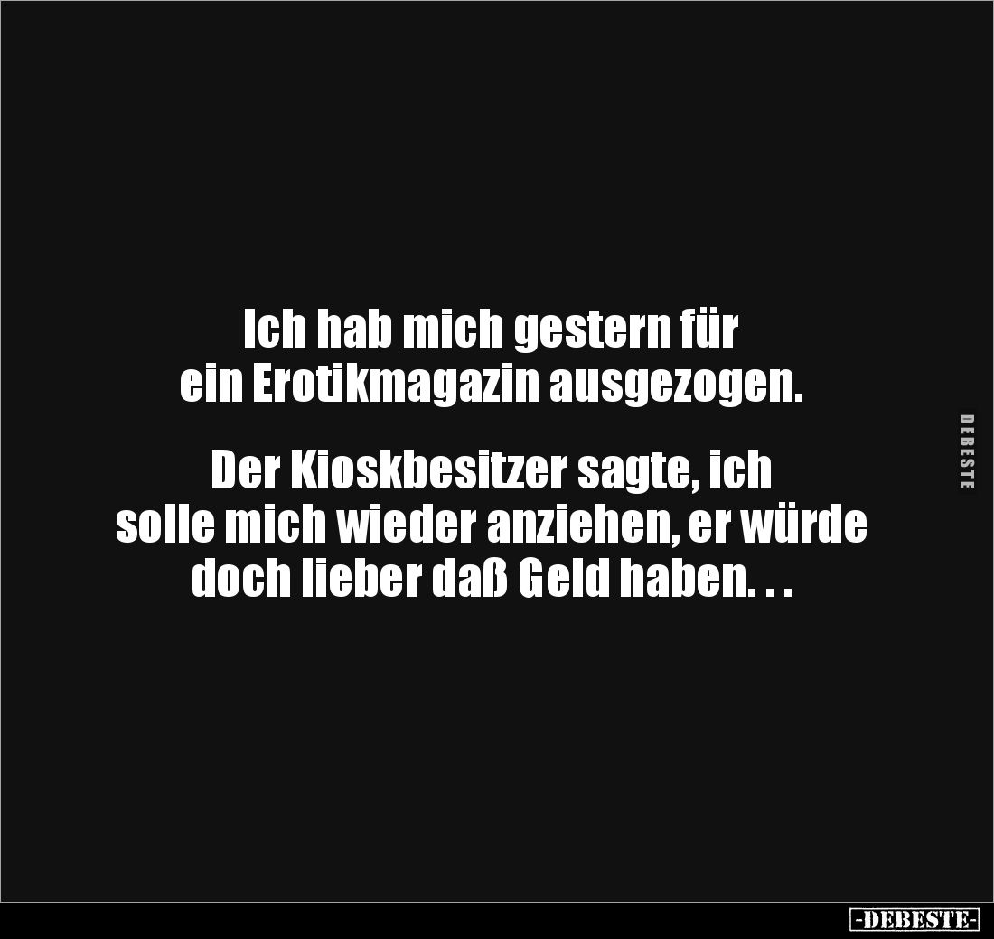 Ich hab mich gestern für ein Erotikmagazin ausgezogen. Der Kioskbesitzer sagte, ich solle mich wieder anziehen, er würde doch lieber daß Geld haben. . .
