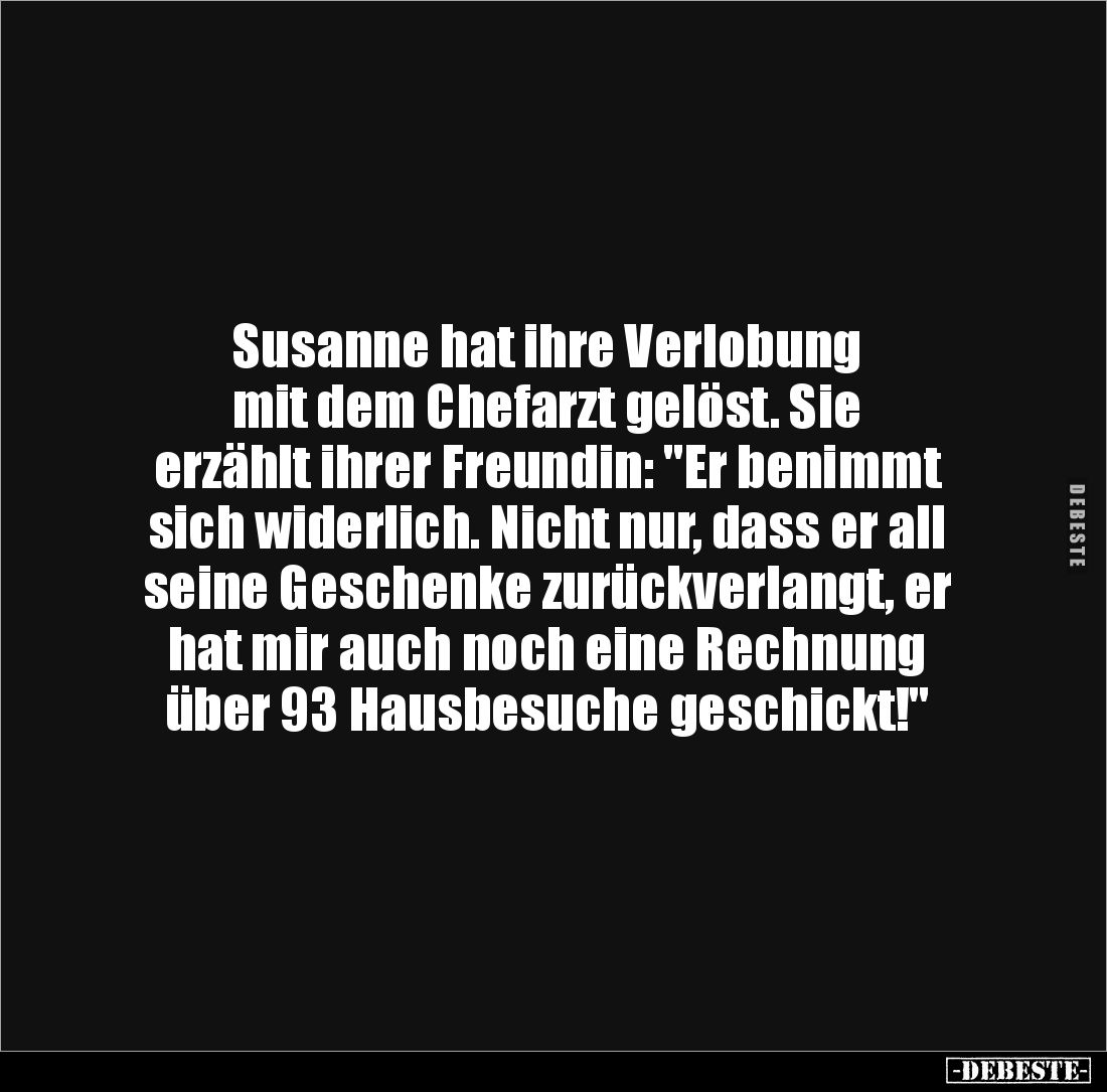Susanne hat ihre Verlobung mit dem Chefarzt gelöst. Sie erzählt ihrer Freundin: "Er benimmt sich widerlich. Nicht nur, dass er all seine Geschenke zurückverlangt, er hat mir auch noch eine Rechnung über 93 Hausbesuche geschickt!"