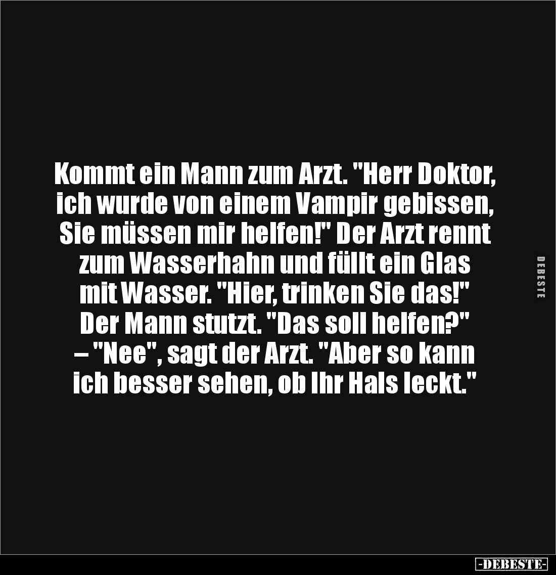 Kommt ein Mann zum Arzt. "Herr Doktor, ich wurde von einem Vampir gebissen, Sie müssen mir helfen!" Der Arzt rennt zum Wasserhahn und füllt ein Glas mit Wasser. "Hier, trinken Sie das!" Der Mann stutzt. "Das soll helfen?" – "Nee", sagt der Arzt. "Aber so kann ich besser sehen, ob Ihr Hals leckt."