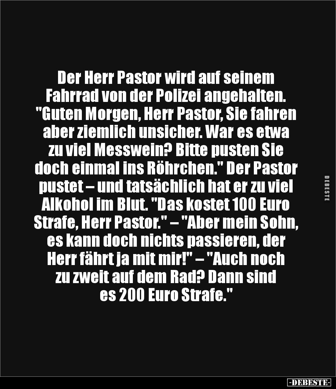 Der Herr Pastor wird auf seinem Fahrrad von der Polizei angehalten. "Guten Morgen, Herr Pastor, Sie fahren aber ziemlich unsicher. War es etwa zu viel Messwein? Bitte pusten Sie doch einmal ins Röhrchen." Der Pastor pustet – und tatsächlich hat er zu viel Alkohol im Blut. "Das kostet 100 Euro Strafe, Herr Pastor." – "Aber mein Sohn, es kann doch nichts passieren, der Herr fährt ja mit mir!" – "Auch noch zu zweit auf dem Rad? Dann sind es 200 Euro Strafe."