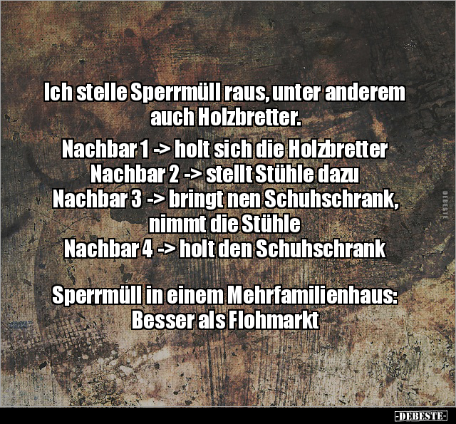 Ich stelle Sperrmüll raus, unter anderem auch Holzbretter. Nachbar 1 -> holt sich die Holzbretter Nachbar 2 -> stellt Stühle dazu Nachbar 3 -> bringt nen Schuhschrank, nimmt die Stühle Nachbar 4 -> holt den Schuhschrank Sperrmüll in einem Mehrfamilienhaus: Besser als Flohmarkt