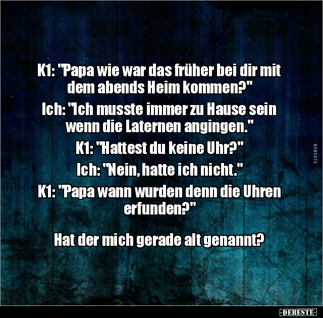 K1: "Papa wie war das früher bei dir mit dem abends Heim kommen?" Ich: "Ich musste immer zu Hause sein wenn die Laternen angingen." K1: "Hattest du keine Uhr?" Ich: "Nein, hatte ich nicht." K1: "Papa wann wurden denn die Uhren erfunden?" Hat der mich gerade alt genannt?