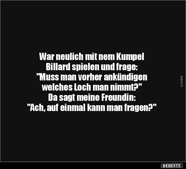 War neulich mit nem Kumpel Billard spielen und frage: "Muss man vorher ankündigen welches Loch man nimmt?" Da sagt meine Freundin: "Ach, auf einmal kann man fragen?"