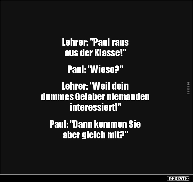 Lehrer: "Paul raus aus der Klasse!" Paul: "Wieso?" Lehrer: "Weil dein dummes Gelaber niemanden interessiert!" Paul: "Dann kommen Sie aber gleich mit?"