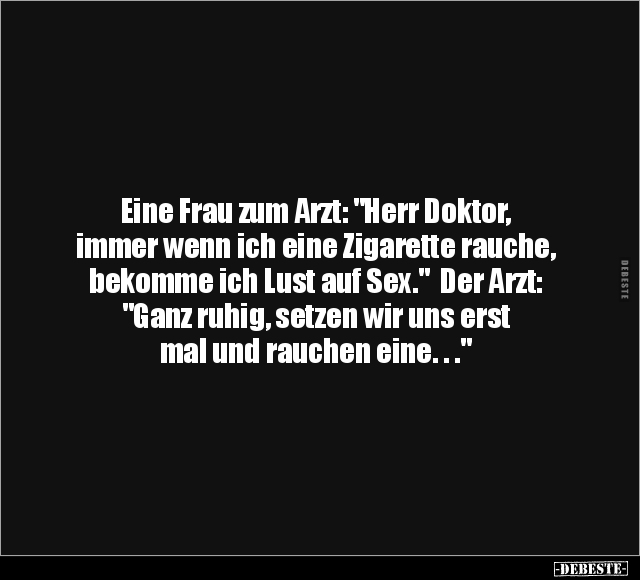 Eine Frau zum Arzt: "Herr Doktor, immer wenn ich eine Zigarette rauche, bekomme ich Lust auf Sex." Der Arzt: "Ganz ruhig, setzen wir uns erst mal und rauchen eine. . ."