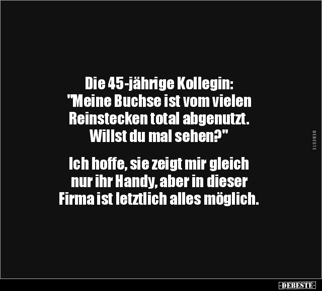 Die 45-jährige Kollegin: "Meine Buchse ist vom vielen Reinstecken total abgenutzt. Willst du mal sehen?" Ich hoffe, sie zeigt mir gleich nur ihr Handy, aber in dieser Firma ist letztlich alles möglich.