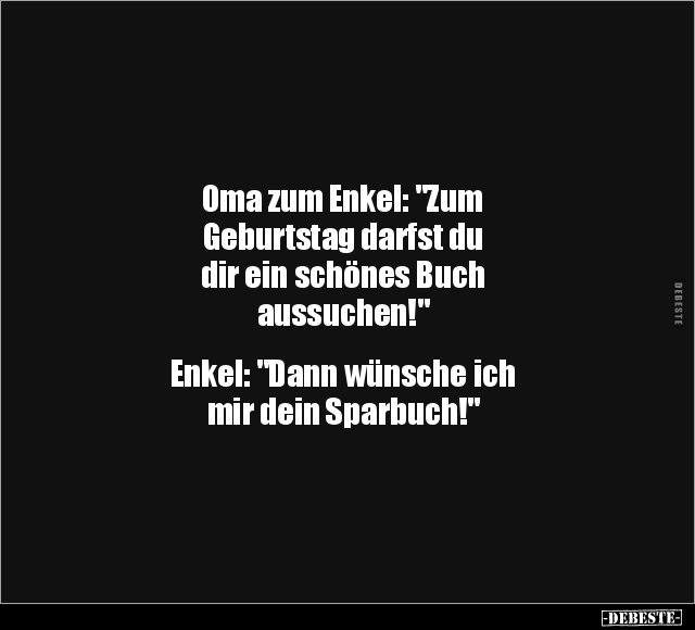 Oma zum Enkel: "Zum Geburtstag darfst du dir ein schönes Buch aussuchen!" Enkel: "Dann wünsche ich mir dein Sparbuch!"