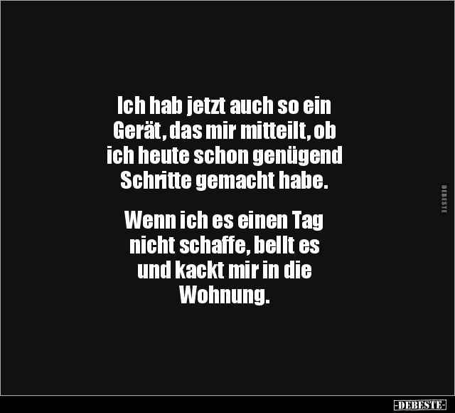 Ich hab jetzt auch so ein Gerät, das mir mitteilt, ob ich heute schon genügend Schritte gemacht habe. Wenn ich es einen Tag nicht schaffe, bellt es und kackt mir in die Wohnung.