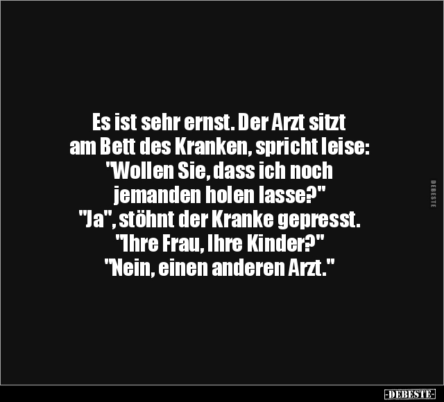 Es ist sehr ernst. Der Arzt sitzt am Bett des Kranken, spricht leise: "Wollen Sie, dass ich noch jemanden holen lasse?" "Ja", stöhnt der Kranke gepresst. "Ihre Frau, Ihre Kinder?" "Nein, einen anderen Arzt."