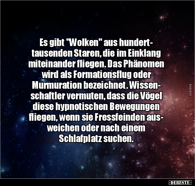 Es gibt "Wolken" aus hundert- tausenden Staren, die im Einklang miteinander fliegen. Das Phänomen wird als Formationsflug oder Murmuration bezeichnet. Wissen- schaftler vermuten, dass die Vögel diese hypnotischen Bewegungen fliegen, wenn sie Fressfeinden aus- weichen oder nach einem Schlafplatz suchen.