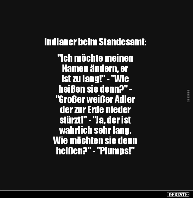 Indianer beim Standesamt: "Ich möchte meinen Namen ändern, er ist zu lang!" - "Wie heißen sie denn?" - "Großer weißer Adler der zur Erde nieder stürzt!" - "Ja, der ist wahrlich sehr lang. Wie möchten sie denn heißen?" - "Plumps!"