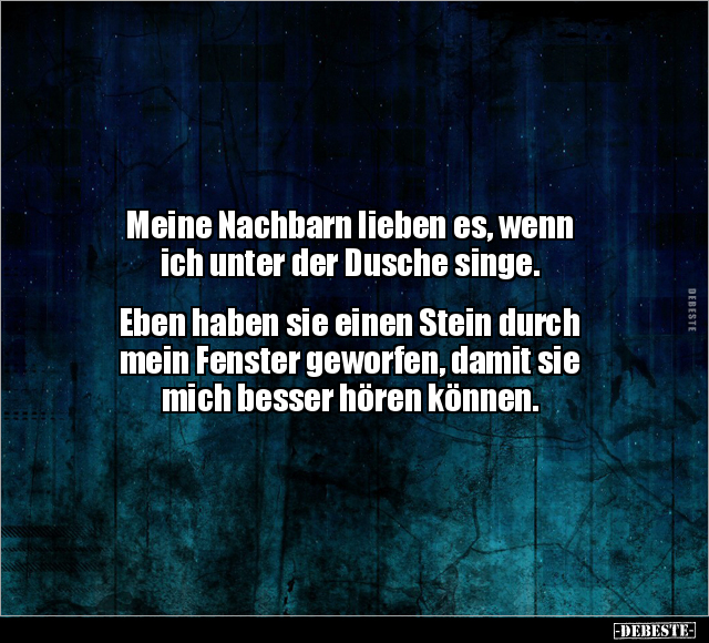 Meine Nachbarn lieben es, wenn ich unter der Dusche singe. Eben haben sie einen Stein durch mein Fenster geworfen, damit sie mich besser hören können.