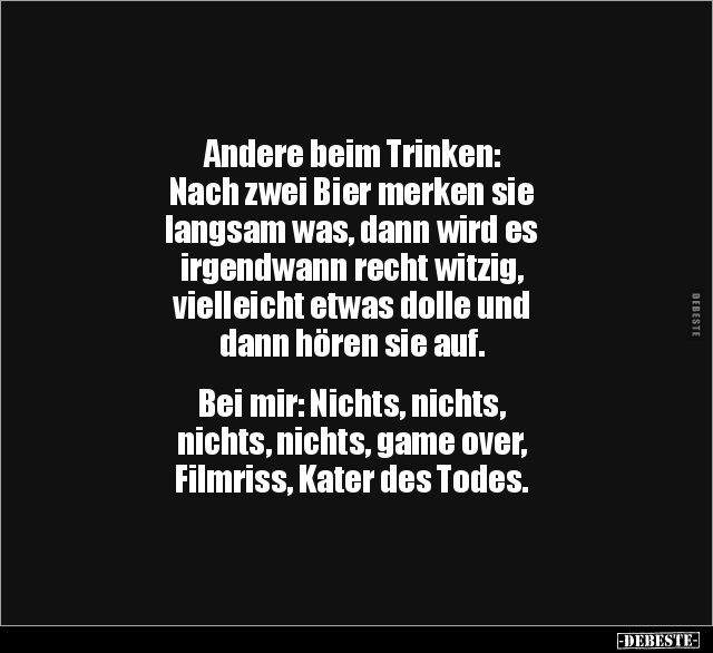 Andere beim Trinken: Nach zwei Bier merken sie langsam was, dann wird es irgendwann recht witzig, vielleicht etwas dolle und dann hören sie auf. Bei mir: Nichts, nichts, nichts, nichts, game over, Filmriss, Kater des Todes.