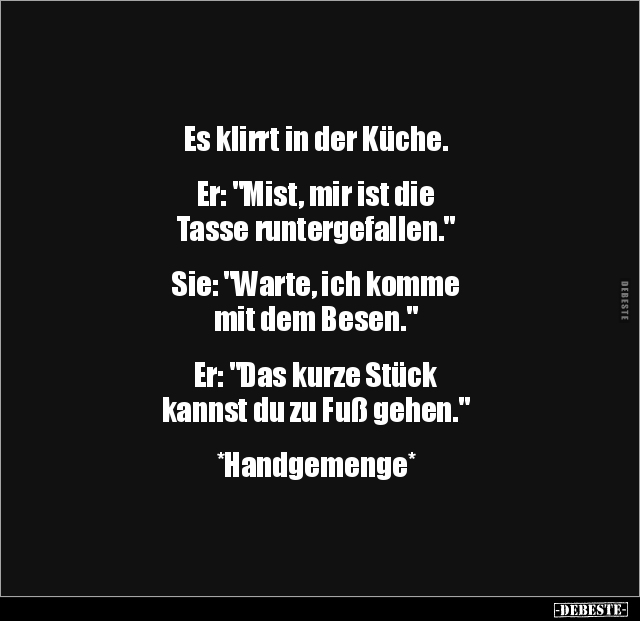 Es klirrt in der Küche. Er: "Mist, mir ist die Tasse runtergefallen." Sie: "Warte, ich komme mit dem Besen." Er: "Das kurze Stück kannst du zu Fuß gehen." *Handgemenge*