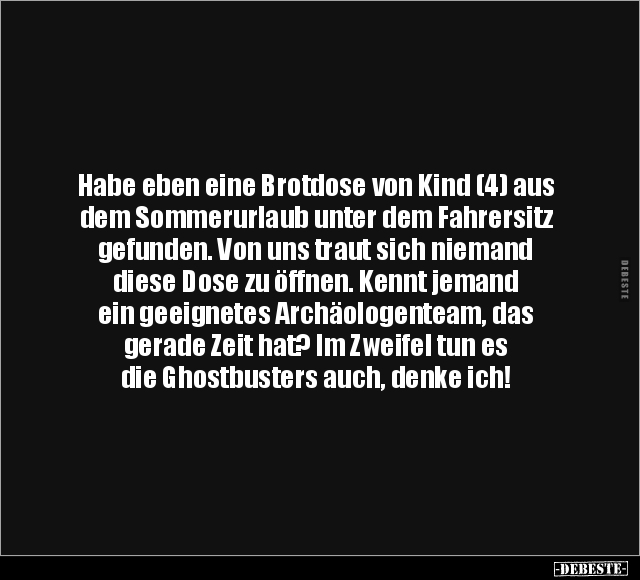 Habe eben eine Brotdose von Kind (4) aus dem Sommerurlaub unter dem Fahrersitz gefunden. Von uns traut sich niemand diese Dose zu öffnen. Kennt jemand ein geeignetes Archäologenteam, das gerade Zeit hat? Im Zweifel tun es die Ghostbusters auch, denke ich!