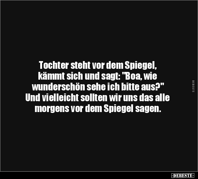 Tochter steht vor dem Spiegel, kämmt sich und sagt: "Boa, wie wunderschön sehe ich bitte aus?" Und vielleicht sollten wir uns das alle morgens vor dem Spiegel sagen.