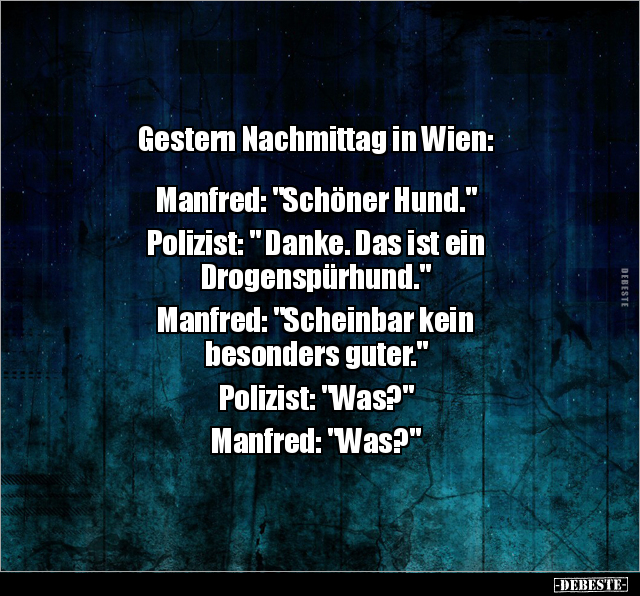 Gestern Nachmittag in Wien: Manfred: "Schöner Hund." Polizist: " Danke. Das ist ein Drogenspürhund." Manfred: "Scheinbar kein besonders guter." Polizist: "Was?" Manfred: "Was?"