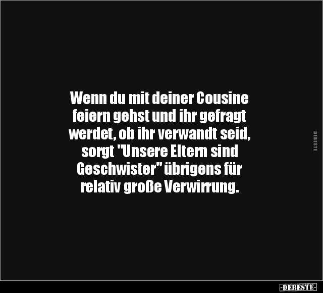 Wenn du mit deiner Cousine feiern gehst und ihr gefragt werdet, ob ihr verwandt seid, sorgt "Unsere Eltern sind Geschwister" übrigens für relativ große Verwirrung.
