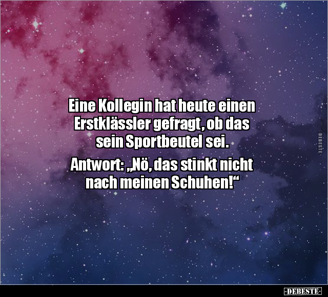 Eine Kollegin hat heute einen Erstklässler gefragt, ob das sein Sportbeutel sei. Antwort: „Nö, das stinkt nicht nach meinen Schuhen!“