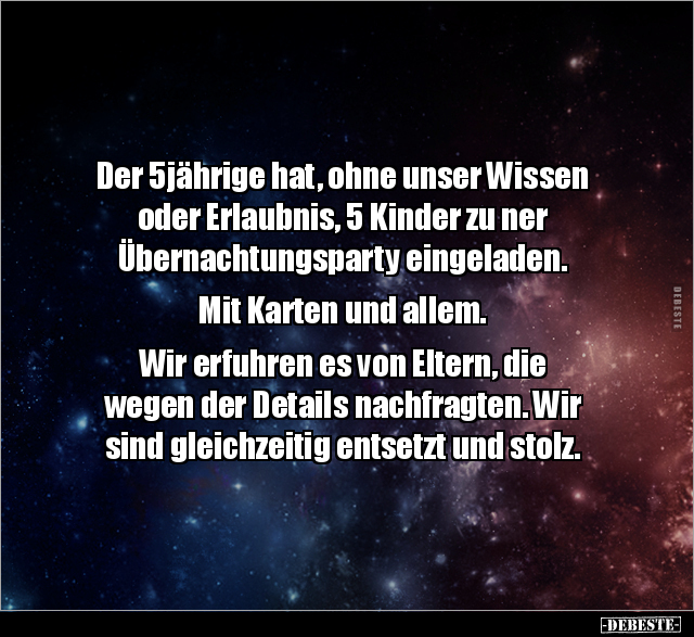 Der 5jährige hat, ohne unser Wissen oder Erlaubnis, 5 Kinder zu ner Übernachtungsparty eingeladen. Mit Karten und allem. Wir erfuhren es von Eltern, die wegen der Details nachfragten. Wir sind gleichzeitig entsetzt und stolz.