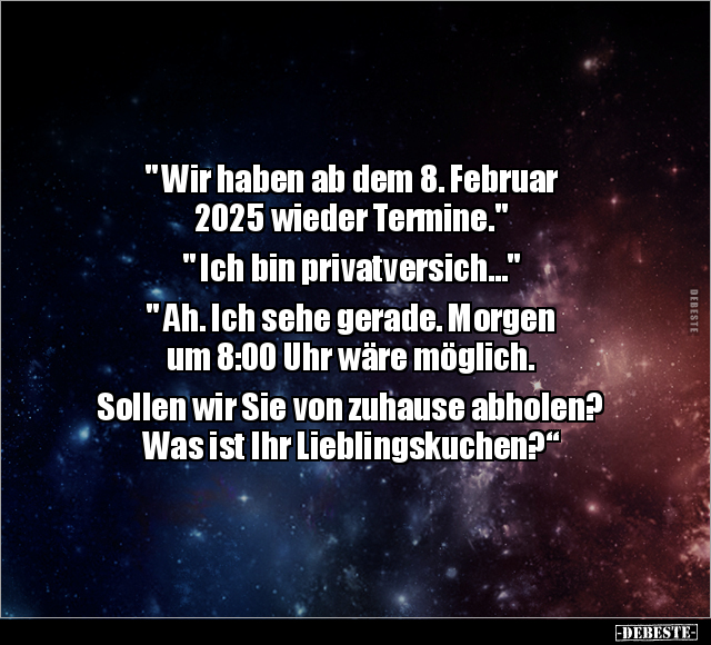 " Wir haben ab dem 8. Februar 2025 wieder Termine." " Ich bin privatversich…" " Ah. Ich sehe gerade. Morgen um 8:00 Uhr wäre möglich. Sollen wir Sie von zuhause abholen? Was ist Ihr Lieblingskuchen?“