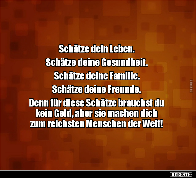 Schätze dein Leben. Schätze deine Gesundheit. Schätze deine Familie. Schätze deine Freunde. Denn für diese Schätze brauchst du kein Geld, aber sie machen dich zum reichsten Menschen der Welt!