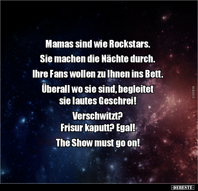 Mamas sind wie Rockstars. Sie machen die Nächte durch. Ihre Fans wollen zu Ihnen ins Bett. Überall wo sie sind, begleitet sie lautes Geschrei! Verschwitzt? Frisur kaputt? Egal! The Show must go on!