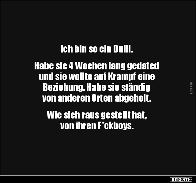Ich bin so ein Dulli. Habe sie 4 Wochen lang gedated und sie wollte auf Krampf eine Beziehung. Habe sie ständig von anderen Orten abgeholt. Wie sich raus gestellt hat, von ihren F*ckboys.