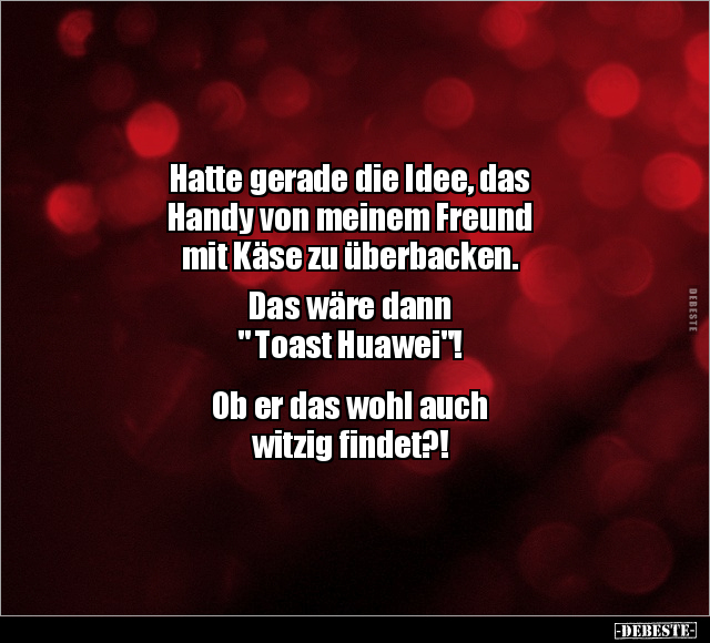 Hatte gerade die Idee, das Handy von meinem Freund mit Käse zu überbacken. Das wäre dann " Toast Huawei"! Ob er das wohl auch witzig findet?!