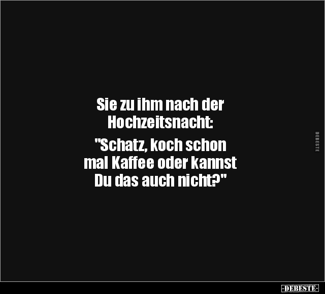 Sie zu ihm nach der Hochzeitsnacht: "Schatz, koch schon mal Kaffee oder kannst Du das auch nicht?"