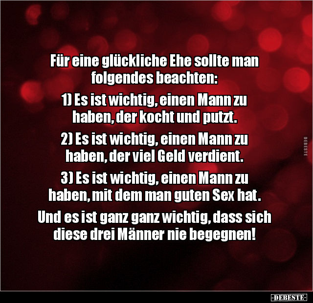 Für eine glückliche Ehe sollte man folgendes beachten: 1) Es ist wichtig, einen Mann zu haben, der kocht und putzt. 2) Es ist wichtig, einen Mann zu haben, der viel Geld verdient. 3) Es ist wichtig, einen Mann zu haben, mit dem man guten Sex hat. Und es ist ganz ganz wichtig, dass sich diese drei Männer nie begegnen!